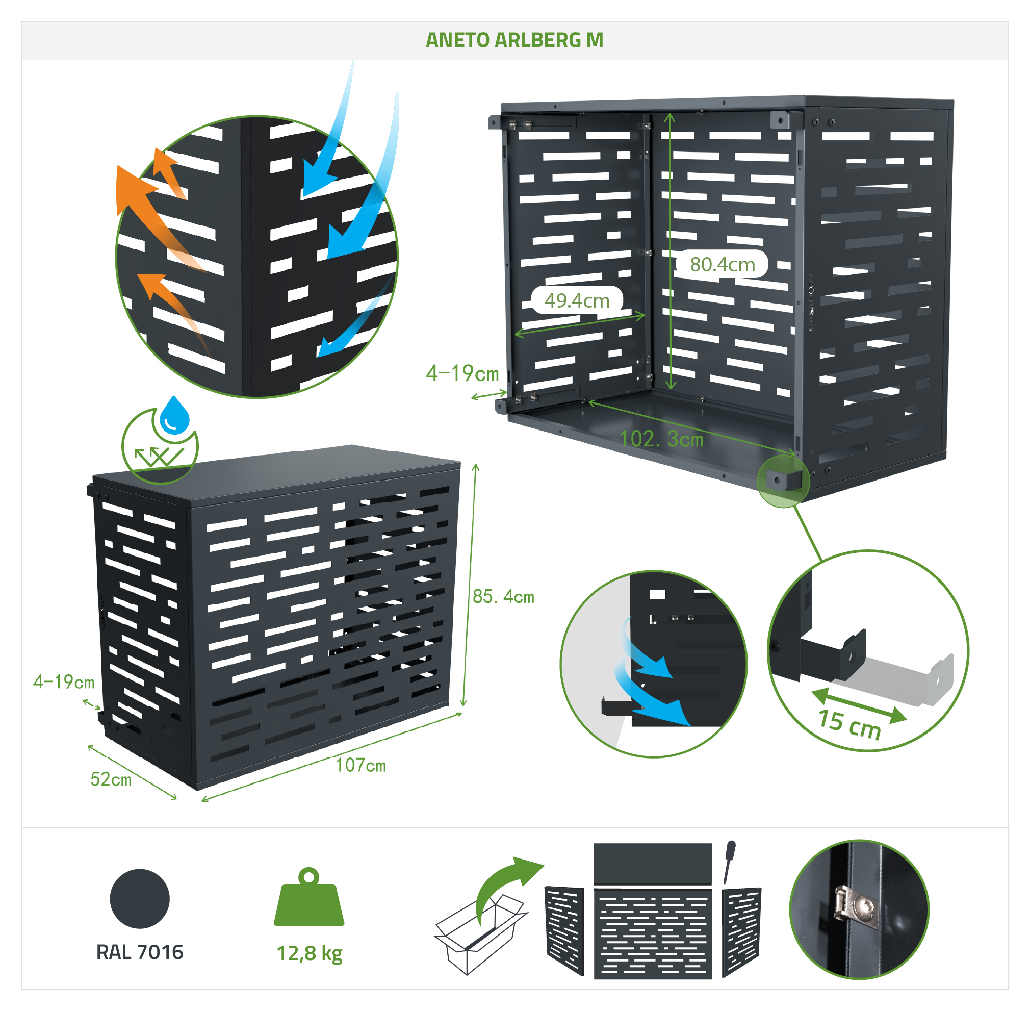 Husa din aluminiu Aneto Arlberg pentru aparat de aer condiționat impresionează prin designul său curat și liniile grafice ajurate care adaugă o notă contemporană exteriorului dumneavoastră. Structura sa din aluminiu asigură ușurință și rezistență optimă la intemperii, facilitând în același timp instalarea și întreținerea. Atât funcțională, cât și plăcută din punct de vedere estetic, această husă pentru aparat de aer condiționat/pompă de căldură ascunde discret unitatea dumneavoastră pentru un aspect armonios și elegant. Un accesoriu decorativ modern, această husă din aluminiu este concepută pentru a vă îmbunătăți fațadele, protejând în același timp eficient echipamentele.