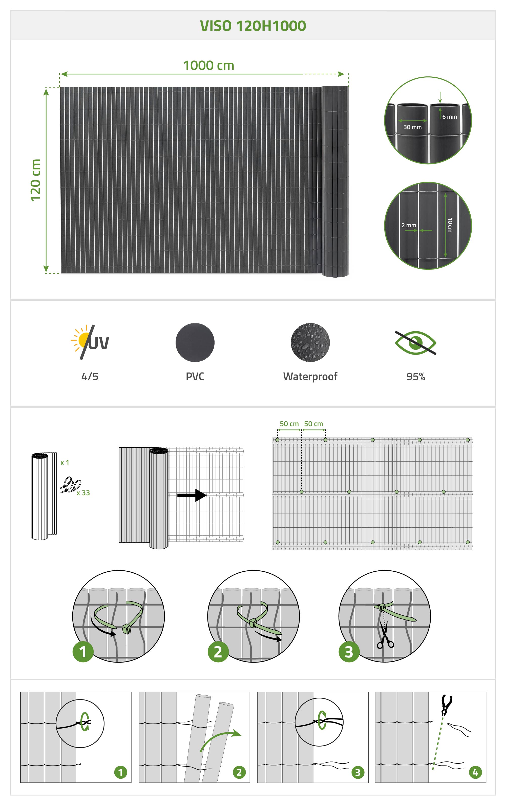 Paravanul din stuf VISO din PVC se remarcă prin lamelele sale cu lățimea de 30 mm, oferind până la 95% intimitate, păstrându-vă intimitatea, permițând în același timp luminii să se filtreze. Cu o densitate de 1,6 kg/m², garantează o structură robustă și stabilă, ușor de instalat și de lungă durată. Rezistent la UV, paravanul din stuf VISO își păstrează aspectul nou sezon după sezon, pentru un paravan de intimitate fiabil și plăcut din punct de vedere estetic. Lamelele paravanului din stuf VISO din PVC sunt conectate printr-un fir metalic învelit în polietilenă (PE). Acest sistem de asamblare asigură o structură mai rezistentă, o durabilitate de lungă durată și un finisaj mai curat decât modelele tradiționale din sârmă de nailon sau lipite. De asemenea, vă permite să ajustați cu ușurință lungimea paravanului în funcție de nevoile dumneavoastră.
