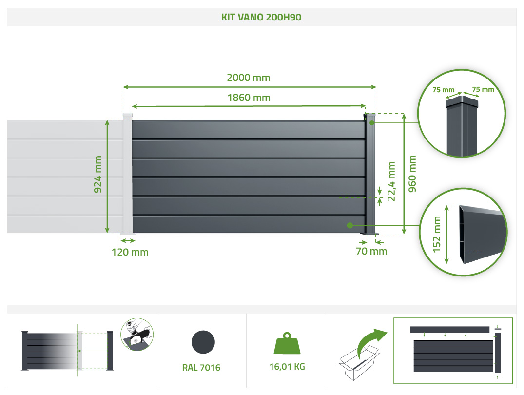 Kit extensie gard 2m VANO H.90cm gri aluminiu