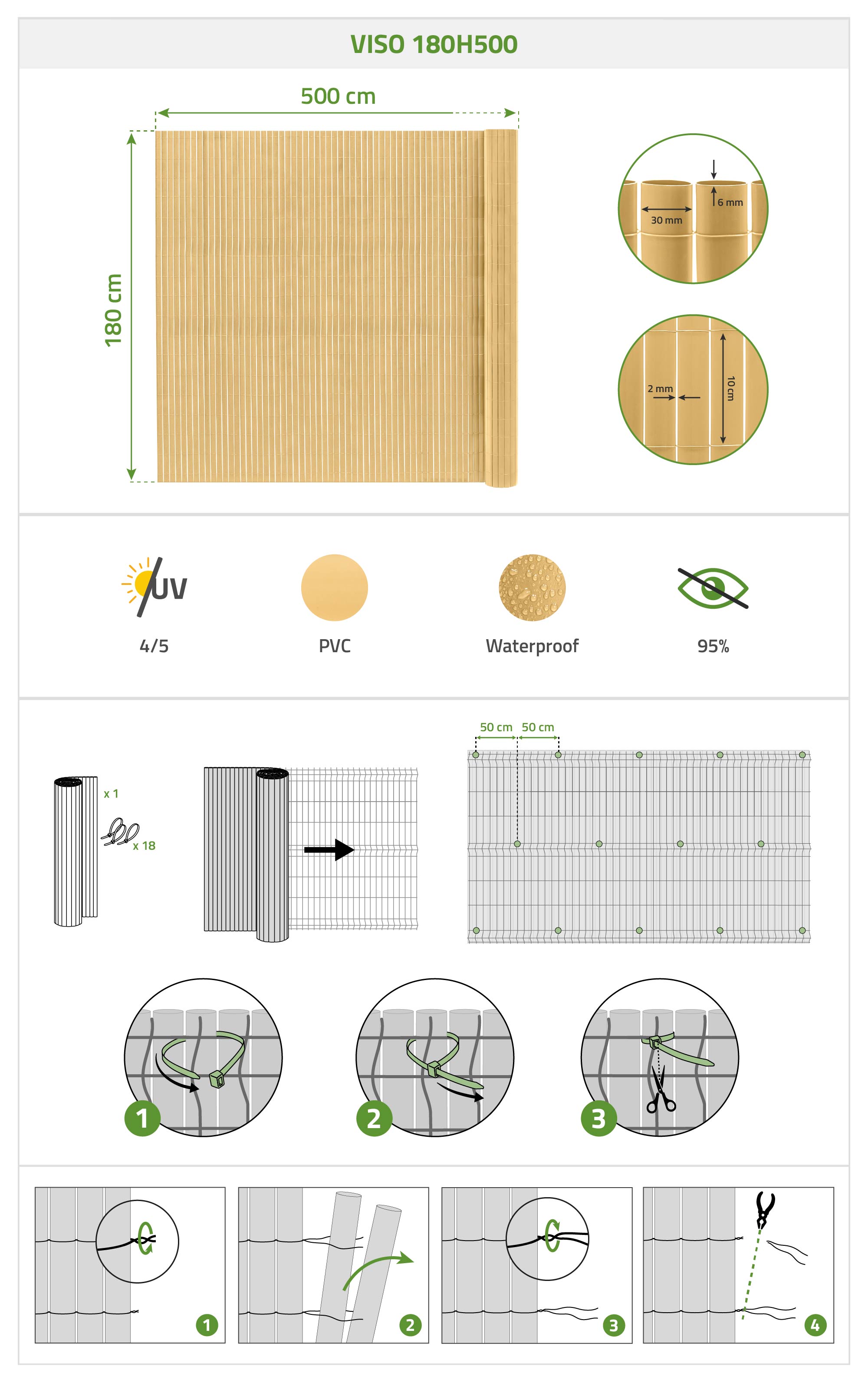 Ecranul din stuf VISIO din PVC are lamele de 30 mm care oferă până la 95% intimitate, păstrându-vă intimitatea, permițând în același timp luminii să se filtreze. Cu o densitate de 1,6 kg/m², rămâne stabil și rezistent, rezistent la intemperii și de lungă durată. Rezistența sa excelentă la UV îi permite să își mențină aspectul și culoarea sezon după sezon, pentru un ecran de intimitate plăcut din punct de vedere estetic și eficient. Fiecare lamă a ecranului din stuf VISIO din PVC este conectată printr-un fir metalic acoperit cu polietilenă (PE), asigurând o structură stabilă și durabilă. Această metodă de asamblare, mai robustă decât firul de nailon sau lipiciul, garantează un finisaj curat și o instalare adaptabilă datorită posibilității de a tăia ecranul la lungimea dorită.