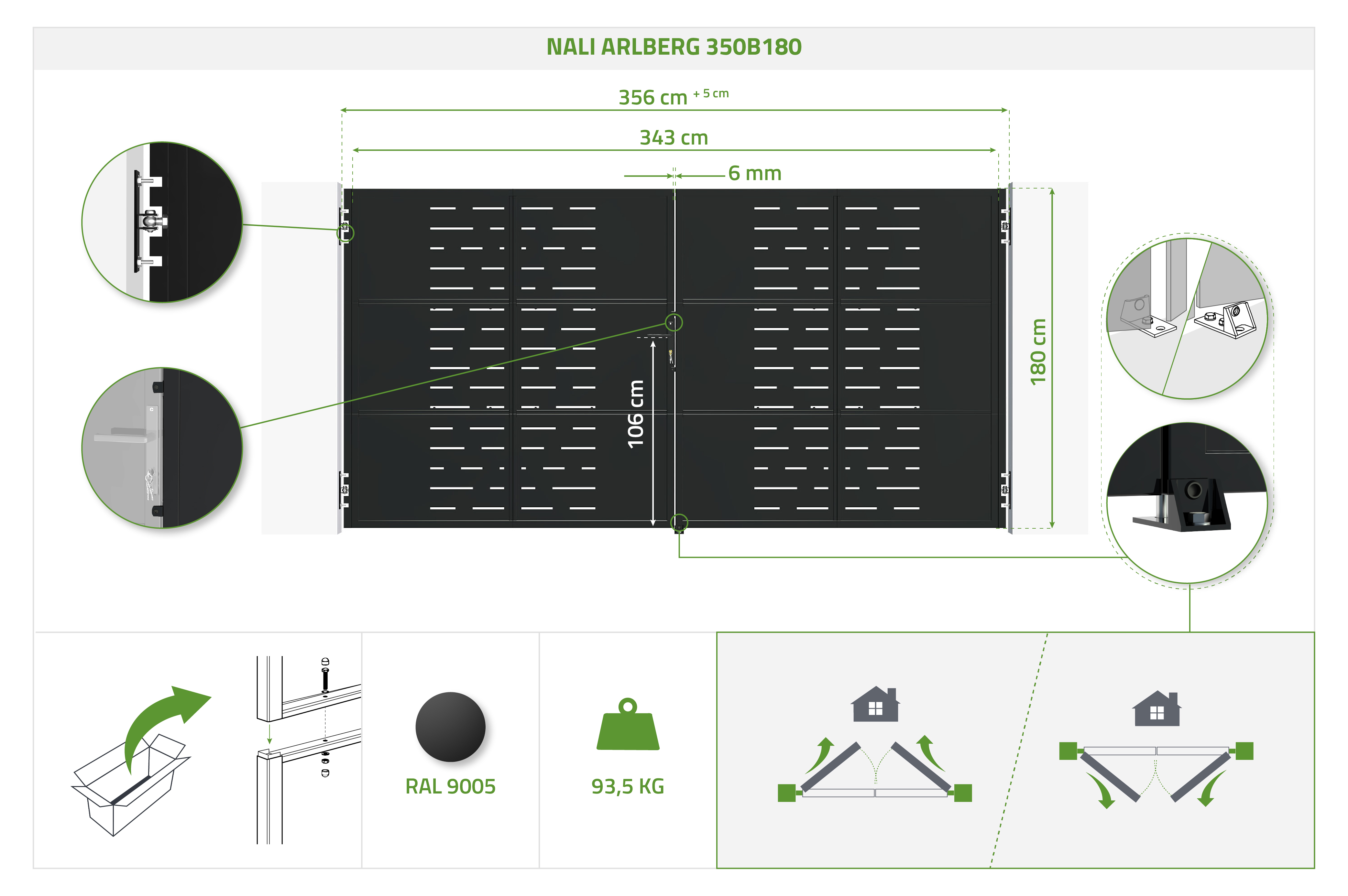 Poartă batantă NALI ARLBERG din oțel negru mat 3,5 m, înălțime 180 cm + motor Ranger B150